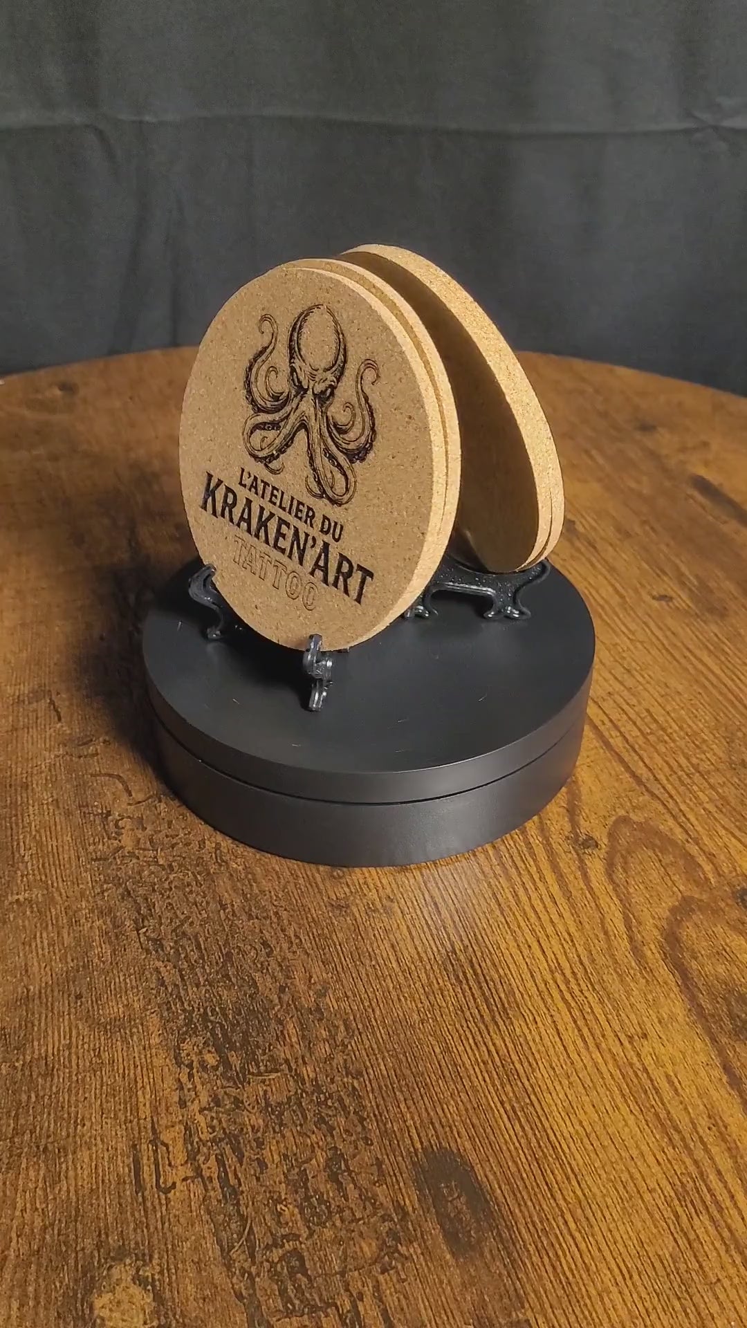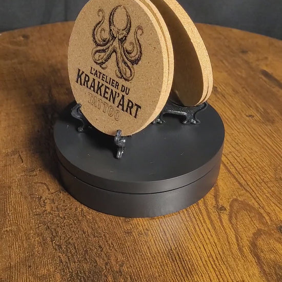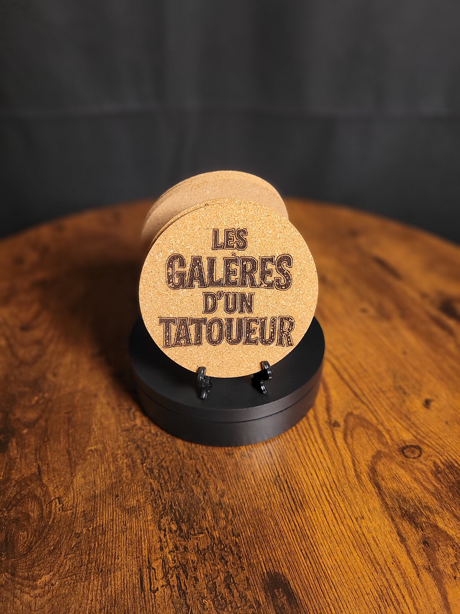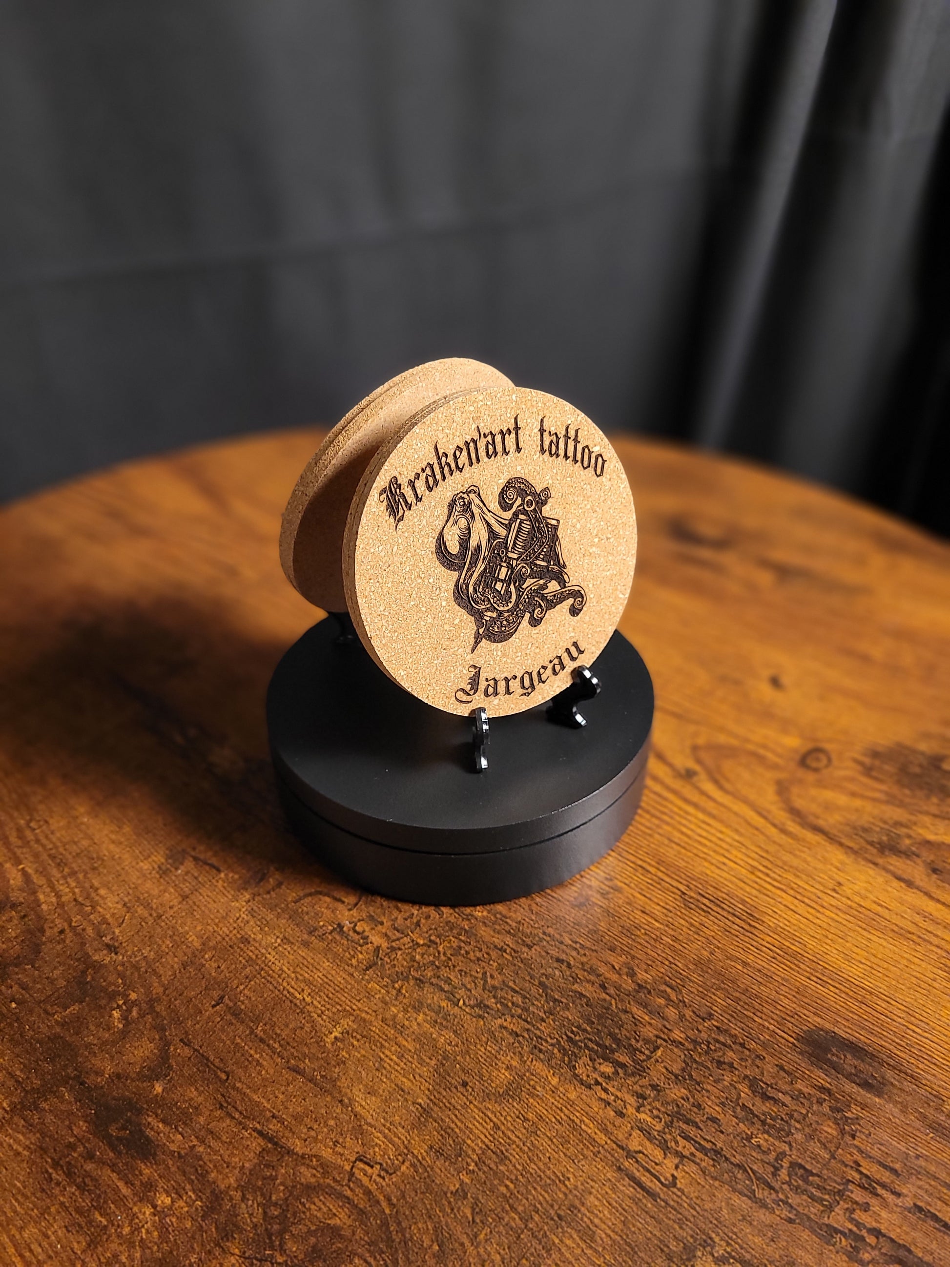Dessous de verre gravés à l'atelier Kraken'Art Tattoo.